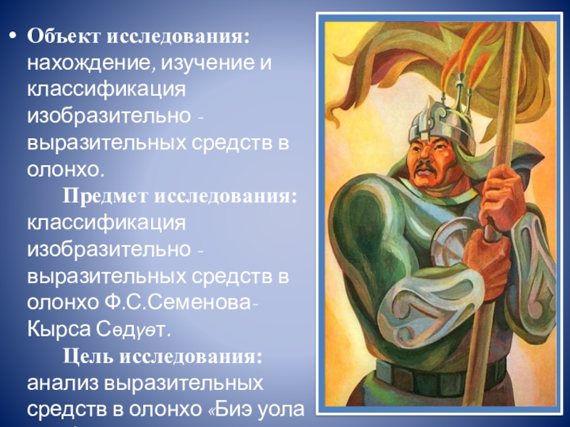 Предмет исследования: классификация изобразительно - выразительных средств в олонхо Ф.С.Семенова-Кырса Сөдүөт.