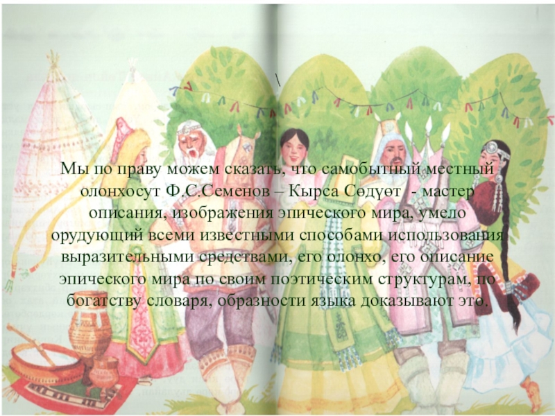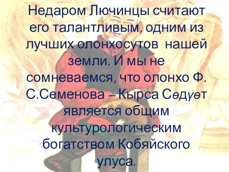 Слайд 10Недаром Лючинцы считают его талантливым, одним из лучших олонхосутов нашей земли.