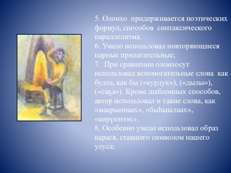 Слайд 75. Олонхо придерживается поэтических формул, способов синтаксического параллелизма.