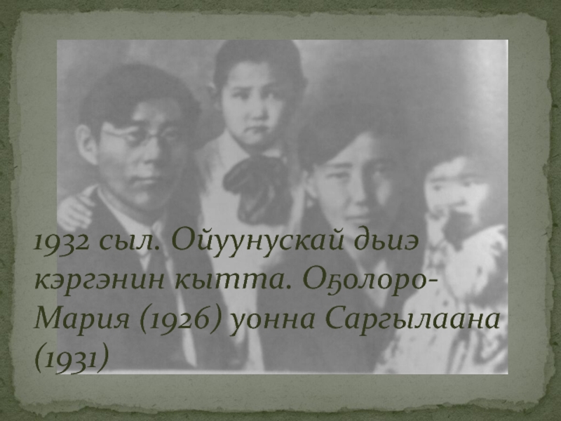 Слайд 101932 сыл. Ойуунускай дьиэ кэргэнин кытта. Оҕолоро- Мария (1926) уонна Саргылаана