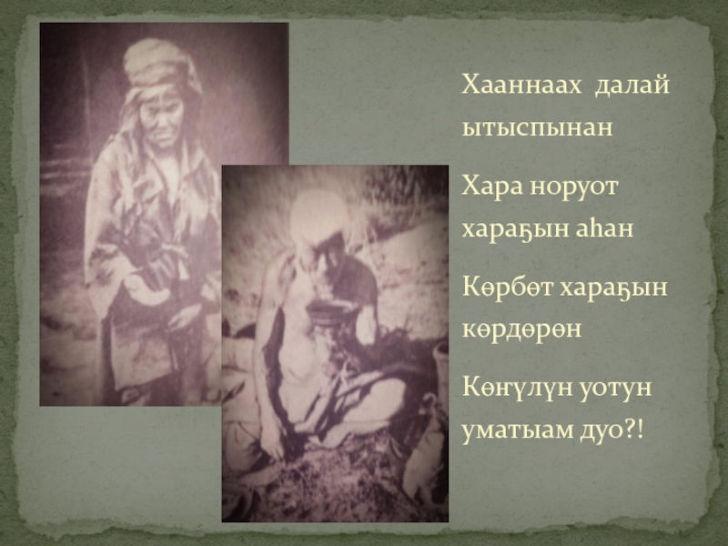 Хааннаах далай ытыспынанХара норуот хараҕын аһанКөрбөт хараҕын көрдөрөнКөҥүлүн уотун уматыам дуо?!