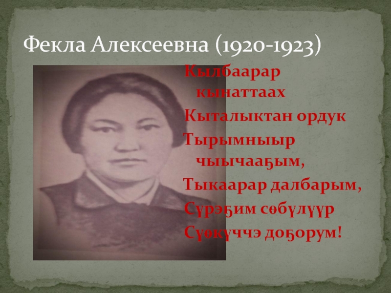 Фекла Алексеевна (1920-1923)Кылбаарар кынаттаахКыталыктан ордукТырымныыр чыычааҕым,Тыкаарар далбарым,Сүрэҕим сөбүлүүрСүөкүччэ доҕорум!