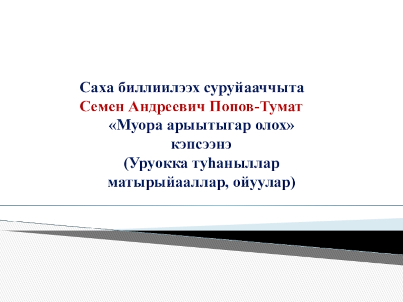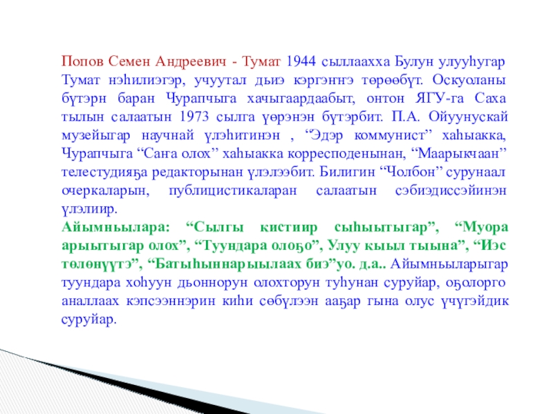 Слайд 3Попов Семен Андреевич - Тумат 1944 сыллаахха Булун улууһугар Тумат нэһилиэгэр,