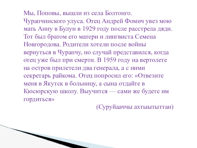 Слайд 4Мы, Поповы, вышли из села Болтонго. Чурапчинского улуса. Отец Андрей Фомич