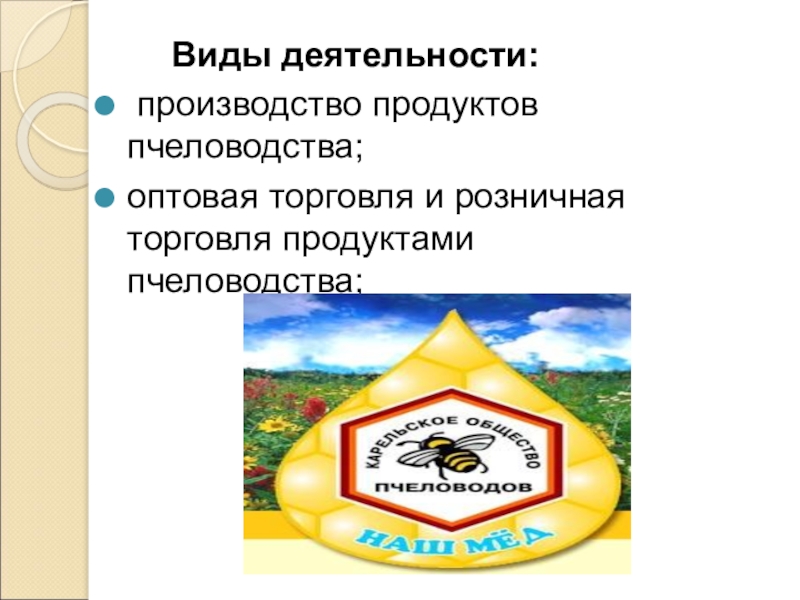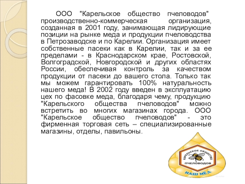 Слайд 6 ООО "Карельское общество пчеловодов" производственно-коммерческая организация, созданная в 2001