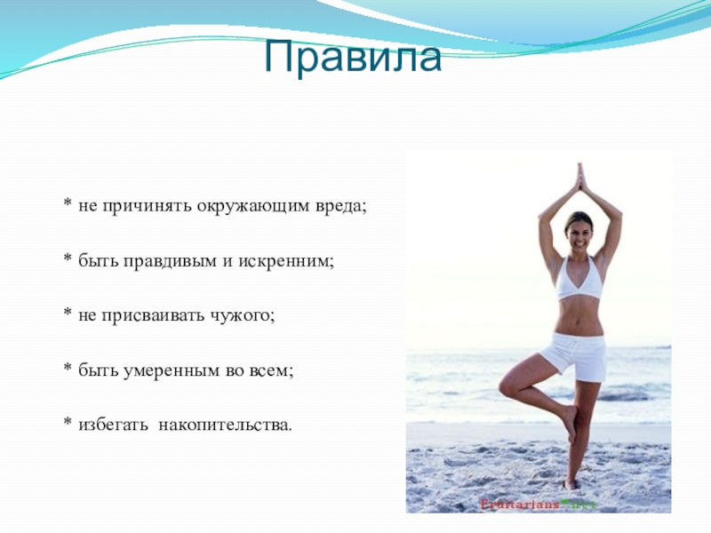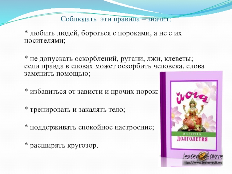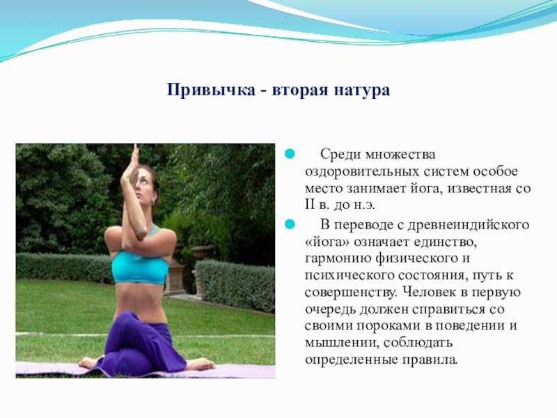 В переводе с древнеиндийского «йога» означает единство, гармонию физического и психического состояния, путь к совершенству. Человек в первую очередь должен справиться со своими пороками в поведении и мышлении, соблюдать определенные правила.