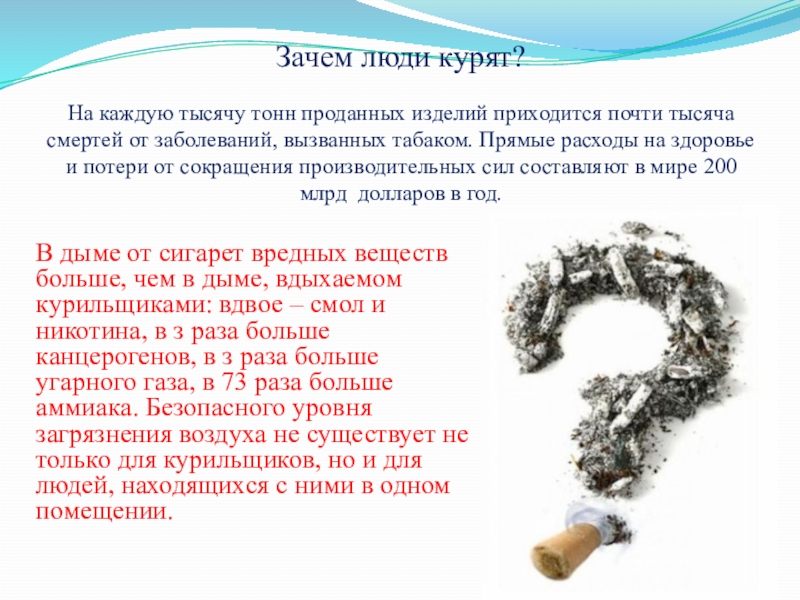 смертей от заболеваний, вызванных табаком. Прямые расходы на здоровье и потери от сокращения производительных сил составляют в мире 200 млрд долларов в год.