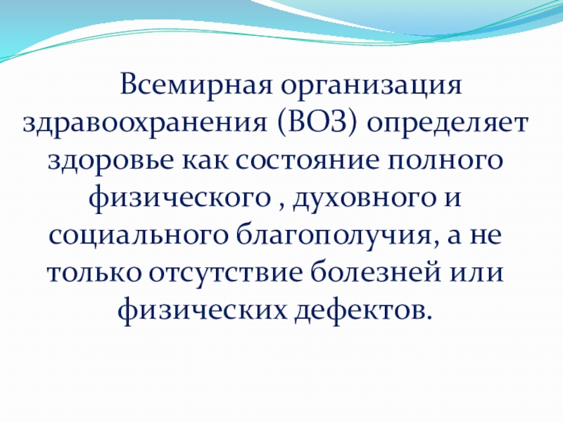 Слайд 6 Всемирная организация здравоохранения (ВОЗ) определяет здоровье как состояние полного