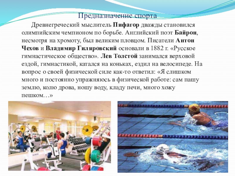 олимпийским чемпионом по борьбе. Английский поэт Байрон, несмотря на хромоту, был великим пловцом. Писатели Антон Чехов и Владимир Гиляровский основали в 1882 г. «Русское гимнастическое общество». Лев Толстой занимался верховой ездой, гимнастикой, катался на коньках, ездил на велосипеде. На вопрос о своей физической силе как-то ответил: «Я слишком много и постоянно упражняюсь в физической работе: сам пашу землю, колю дрова, ношу воду, кладу печи, много хожу пешком…»