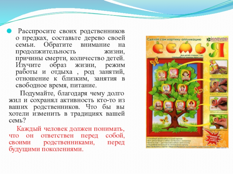 Слайд 27 Расспросите своих родственников о предках, составьте дерево своей семьи. Обратите