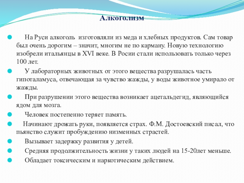 Начинают дрожать руки, появляется страх. Ф.М. Достоевский писал, что пьянство служит пробуждению низменных страстей.