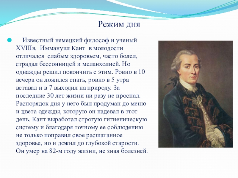 в молодости отличался слабым здоровьем, часто болел, страдал бессонницей и меланхолией. Но однажды решил покончить с этим. Ровно в 10 вечера он ложился спать, ровно в 5 утра вставал и в 7 выходил на природу. За последние 30 лет жизни ни разу не проспал. Распорядок дня у него был продуман до меню и цвета одежды, которую он надевал в этот день. Кант выработал строгую гигиеническую систему и благодаря точному ее соблюдению не только поправил свое расшатанное здоровье, но и дожил до глубокой старости. Он умер на 82-м году жизни, не зная болезней.