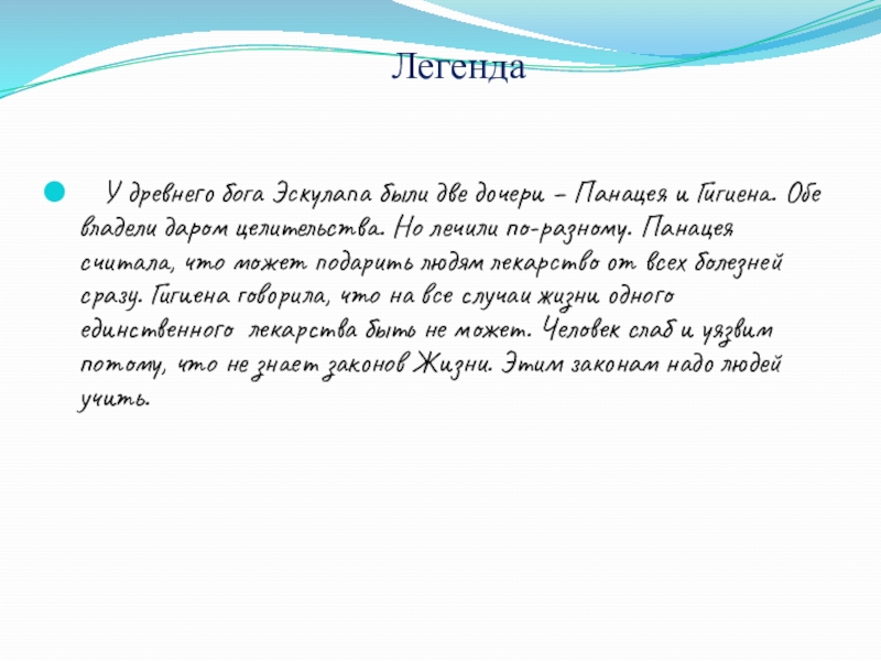 – Панацея и Гигиена. Обе владели даром целительства. Но лечили по-разному. Панацея считала, что может подарить людям лекарство от всех болезней сразу. Гигиена говорила, что на все случаи жизни одного единственного лекарства быть не может. Человек слаб и уязвим потому, что не знает законов Жизни. Этим законам надо людей учить.