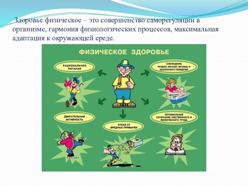 Слайд 8 Здоровье физическое – это совершенство саморегуляции в организме, гармония физиологических