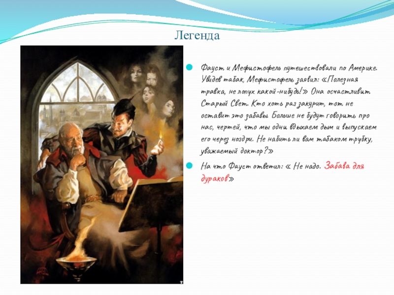 Фауст и Мефистофель путешествовали по Америке. Увидев табак, Мефистофель заявил: «Полезная