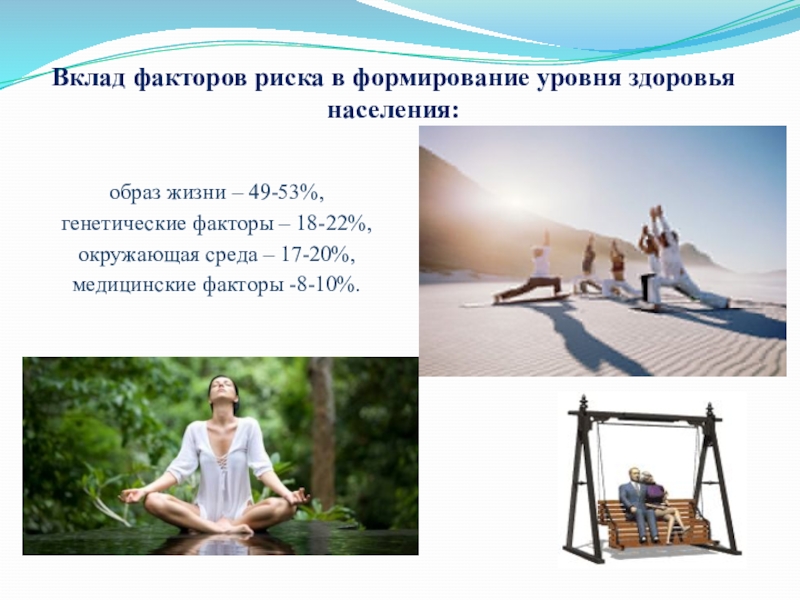 Слайд 22Вклад факторов риска в формирование уровня здоровья населения: