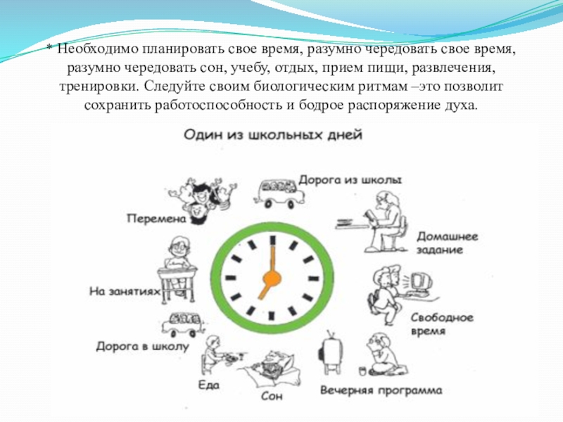Слайд 17* Необходимо планировать свое время, разумно чередовать свое время, разумно чередовать
