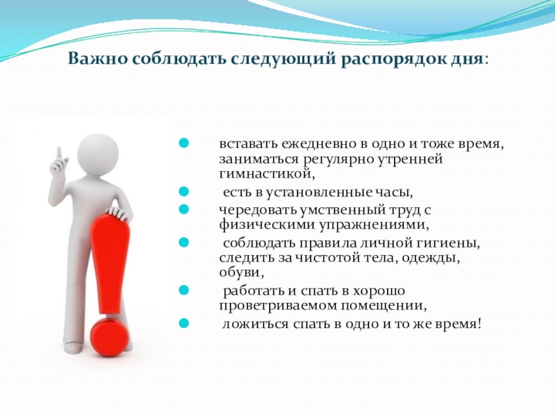 Слайд 18Важно соблюдать следующий распорядок дня: