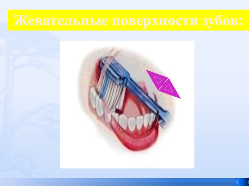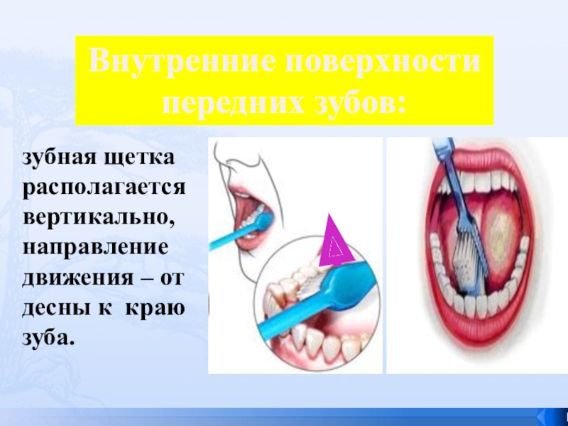 Слайд 32 зубная щетка располагается вертикально, направление движения – от десны