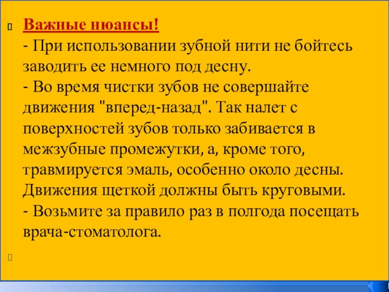 - При использовании зубной нити не бойтесь заводить ее немного