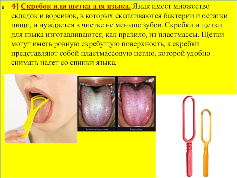 в которых скапливаются бактерии и остатки пищи, и нуждается в чистке не меньше зубов. Скребки и щетки для языка изготавливаются, как правило, из пластмассы. Щетки могут иметь ровную скребущую поверхность, а скребки представляют собой пластмассовую петлю, которой удобно снимать налет со спинки языка.