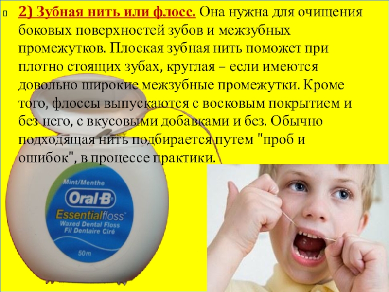 и межзубных промежутков. Плоская зубная нить поможет при плотно стоящих зубах, круглая – если имеются довольно широкие межзубные промежутки. Кроме того, флоссы выпускаются с восковым покрытием и без него, с вкусовыми добавками и без. Обычно подходящая нить подбирается путем "проб и ошибок", в процессе практики.