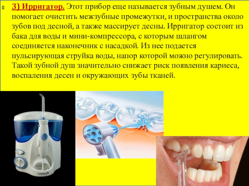 3) Ирригатор. Этот прибор еще называется зубным душем. Он помогает очистить межзубные