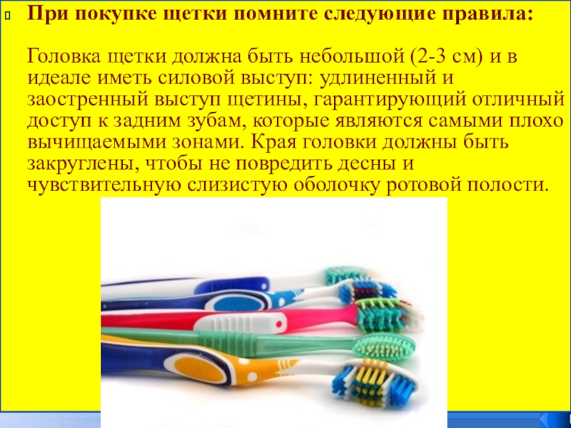 см) и в идеале иметь силовой выступ: удлиненный и заостренный выступ щетины, гарантирующий отличный доступ к задним зубам, которые являются самыми плохо вычищаемыми зонами. Края головки должны быть закруглены, чтобы не повредить десны и чувствительную слизистую оболочку ротовой полости.