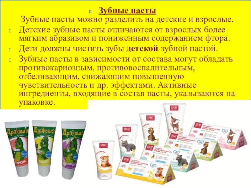 пасты отличаются от взрослых более мягким абразивом и пониженным содержанием фтора.