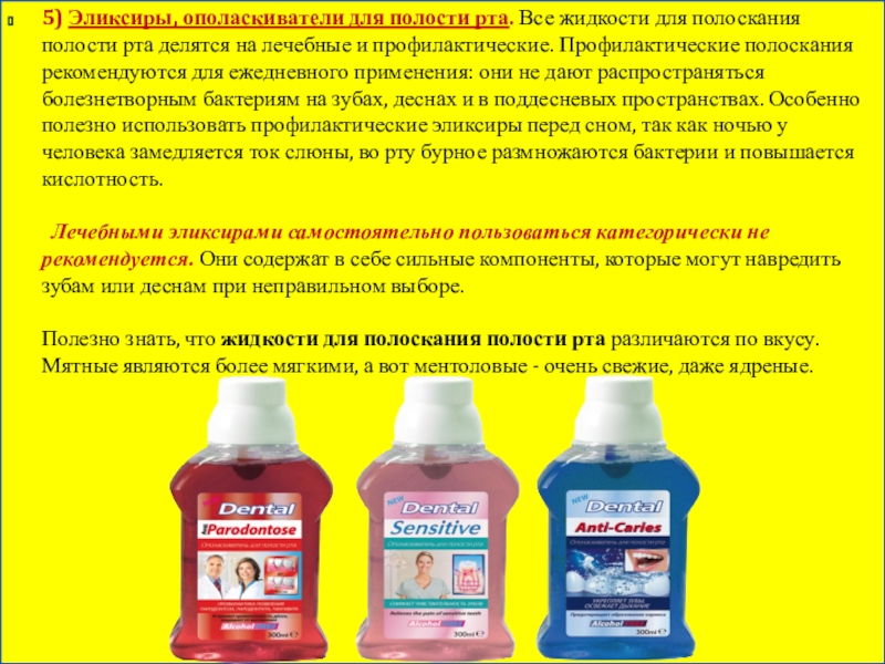 5) Эликсиры, ополаскиватели для полости рта. Все жидкости для полоскания полости рта