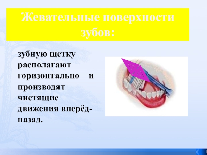 Слайд 34 зубную щетку располагают горизонтально и производят чистящие движения