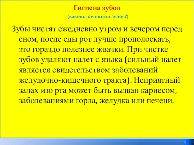 сном, после еды рот лучше прополоскать, это гораздо полезнее жвачки. При чистке зубов удаляют налет с языка (сильный налет является свидетельством заболеваний желудочно-кишечного тракта). Неприятный запах изо рта может быть вызван кариесом, заболеваниями горла, желудка или печени.