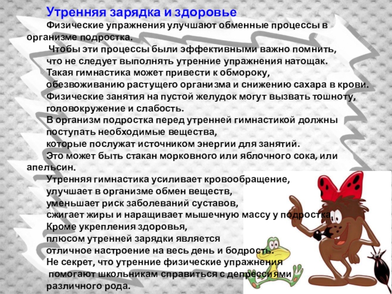 Утренняя зарядка и здоровьеФизические упражнения улучшают обменные процессы в организме подростка. Чтобы эти процессы были эффективными важно