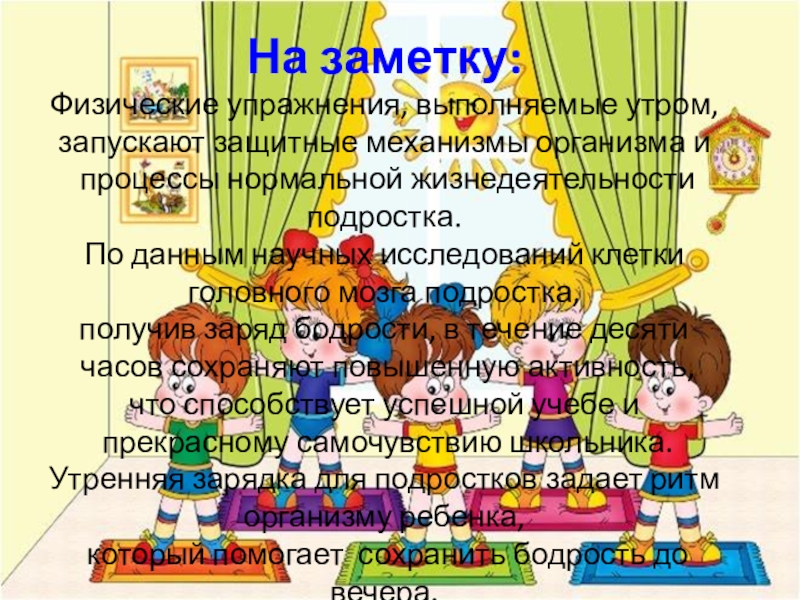 На заметку:Физические упражнения, выполняемые утром, запускают защитные механизмы организма и процессы нормальной жизнедеятельности подростка. По данным научных
