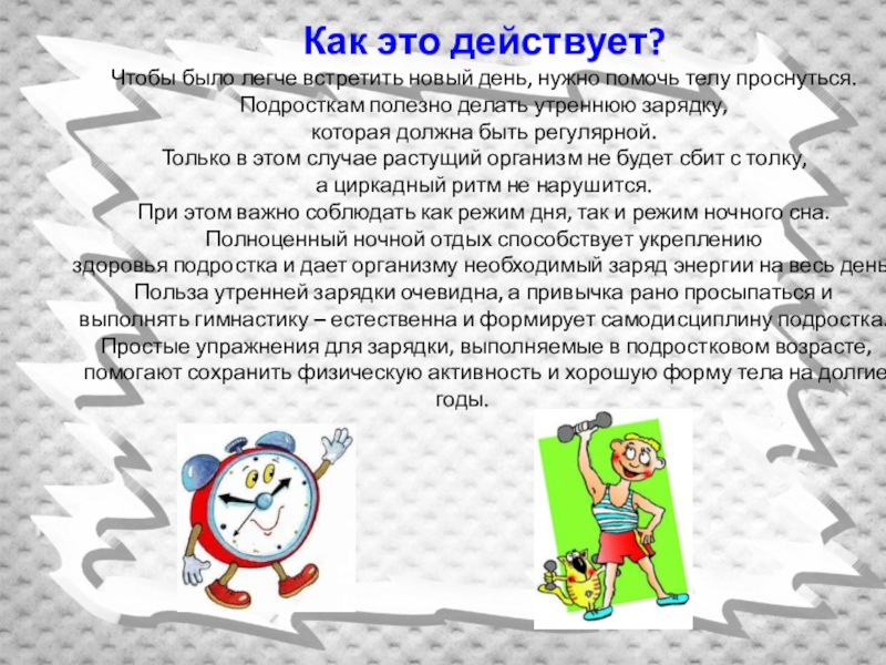 Как это действует?Чтобы было легче встретить новый день, нужно помочь телу проснуться. Подросткам полезно делать утреннюю зарядку,