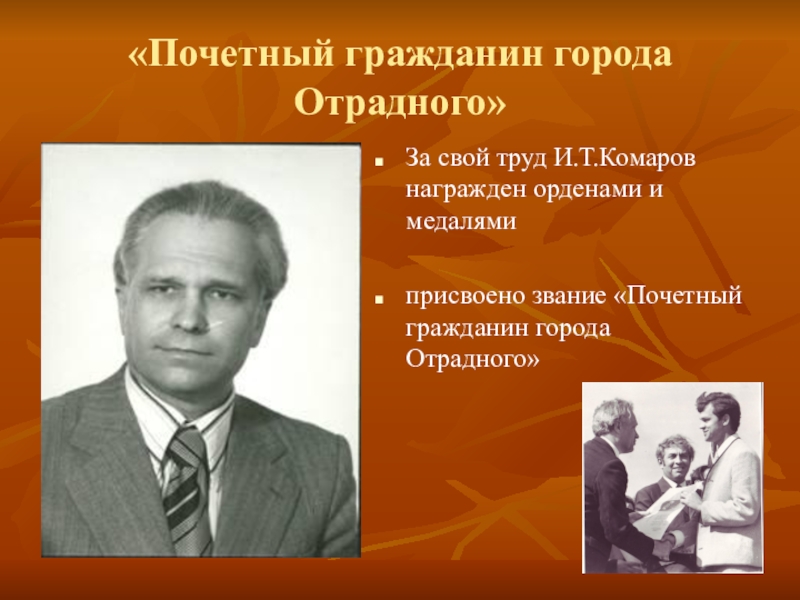 «Почетный гражданин города Отрадного»За свой труд И.Т.Комаров награжден орденами и медалямиприсвоено звание «Почетный гражданин города Отрадного»