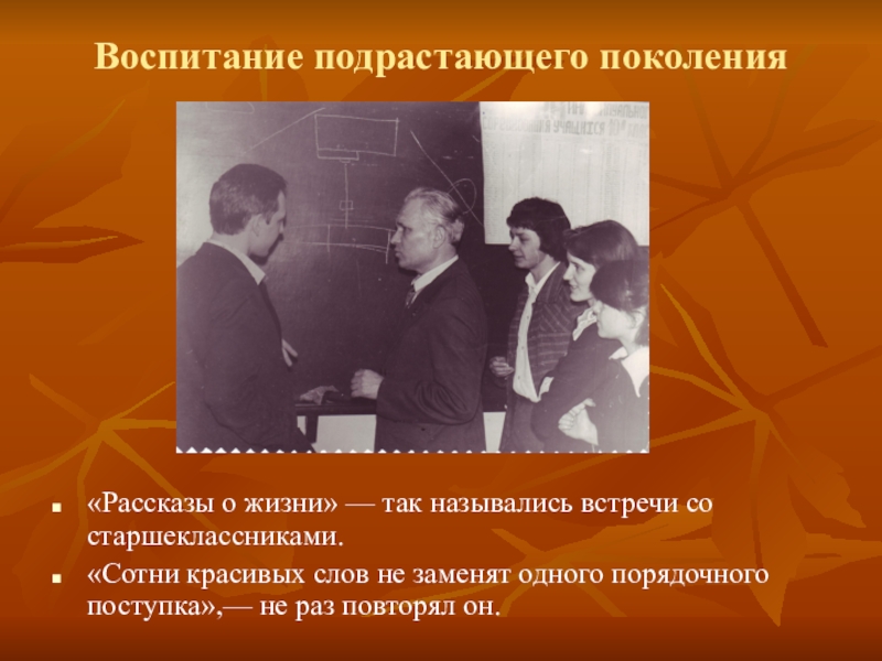 Воспитание подрастающего поколения«Рассказы о жизни» — так назывались встречи со старшеклассниками.«Сотни красивых слов не заменят одного порядочного