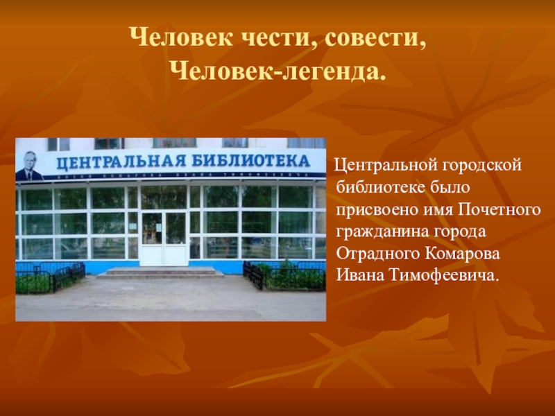 Человек чести, совести,  Человек-легенда.      Центральной городской библиотеке было присвоено имя Почетного