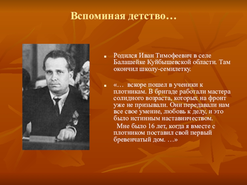 Вспоминая детство… Родился Иван Тимофеевич в селе Балашейке Куйбышевской области. Там окончил школу-семилетку.«… вскоре пошел в ученики