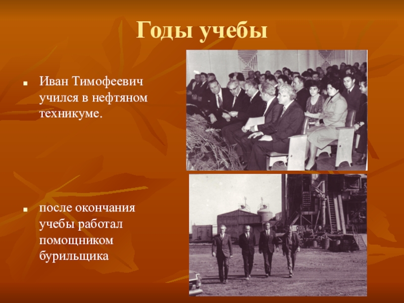Годы учебыИван Тимофеевич учился в нефтяном техникуме.после окончания учебы работал помощником бурильщика