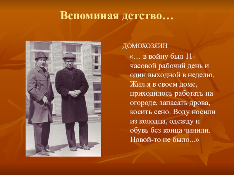 Вспоминая детство… ДОМОХОЗЯИН   «… в войну был 11-часовой рабочий день и один выходной в неделю.