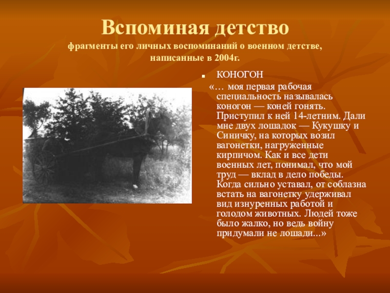«… моя первая рабочая специальность называлась коногон — коней гонять. Приступил к ней 14-летним. Дали мне двух лошадок — Кукушку и Синичку, на которых возил вагонетки, нагруженные кирпичом. Как и все дети военных лет, понимал, что мой труд — вклад в дело победы. Когда сильно уставал, от соблазна встать на вагонетку удерживал вид изнуренных работой и голодом животных. Людей тоже было жалко, но ведь войну придумали не лошади...»