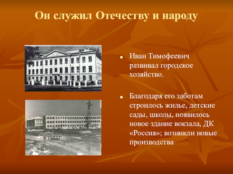 Он служил Отечеству и народуИван Тимофеевич развивал городское хозяйство. Благодаря его заботам строилось жилье, детские сады, школы,