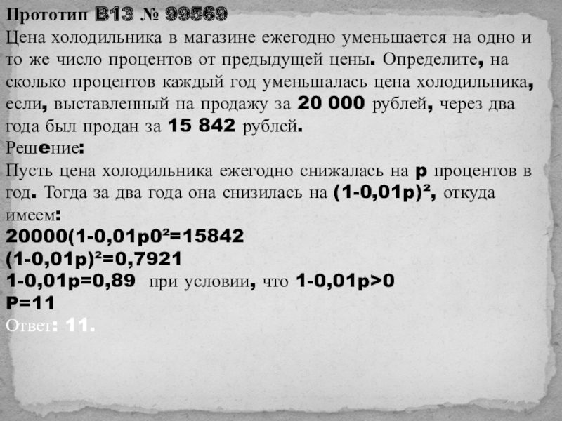 и то же число процентов от предыдущей цены. Определите, на сколько процентов каждый год уменьшалась цена холодильника, если, выставленный на продажу за 20 000 рублей, через два года был продан за 15 842 рублей.
