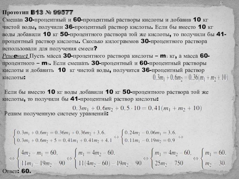 10 кг чистой воды, получили 36-процентный раствор кислоты. Если бы вместо 10 кг воды добавили 10 кг 50-процентного раствора той же кислоты, то получили бы 41-процентный раствор кислоты. Сколько килограммов 30-процентного раствора использовали для получения смеси?