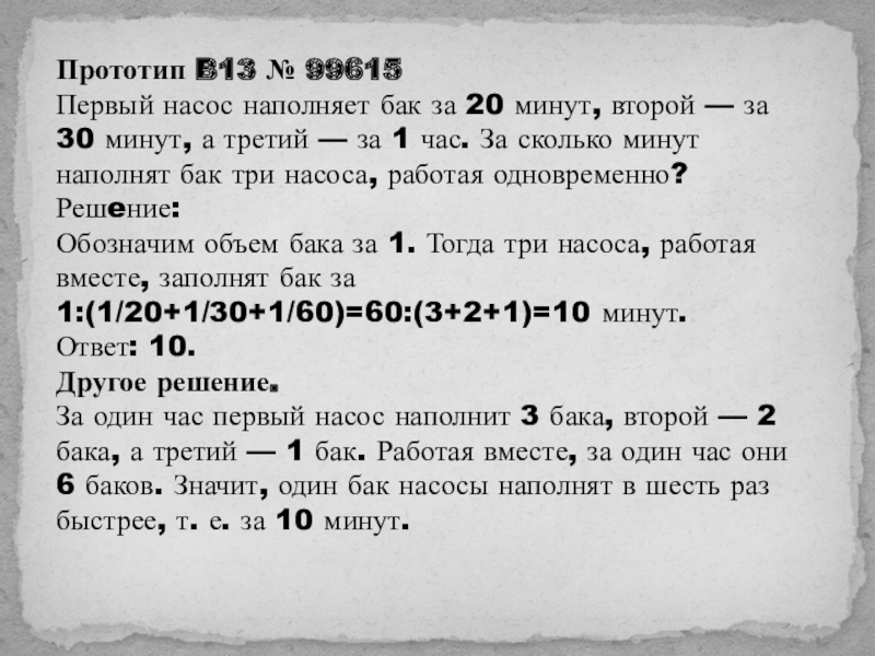 — за 30 минут, а третий — за 1 час. За сколько минут наполнят бак три насоса, работая одновременно?