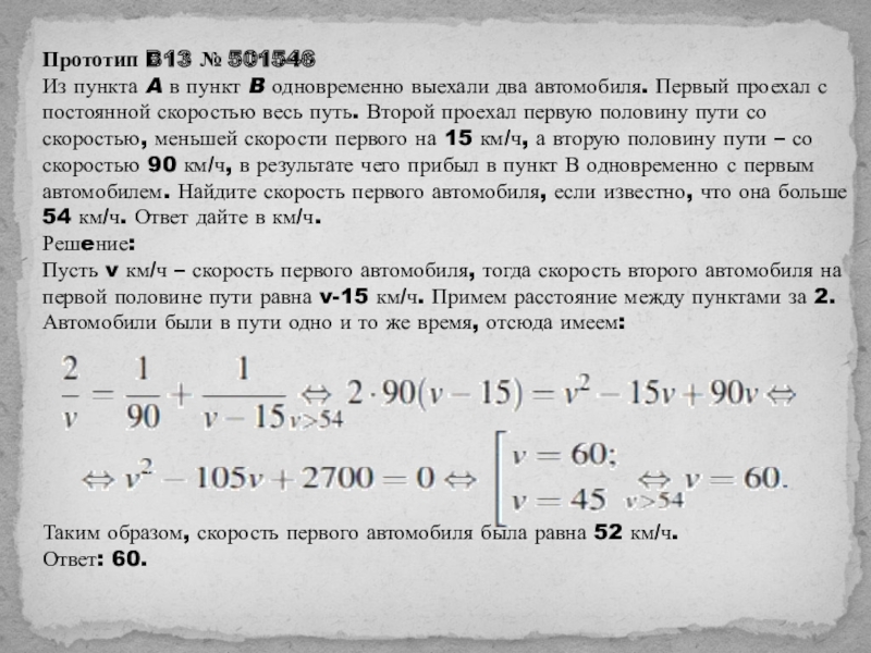 с постоянной скоростью весь путь. Второй проехал первую половину пути со скоростью, меньшей скорости первого на 15 км/ч, а вторую половину пути – со скоростью 90 км/ч, в результате чего прибыл в пункт В одновременно с первым автомобилем. Найдите скорость первого автомобиля, если известно, что она больше 54 км/ч. Ответ дайте в км/ч.