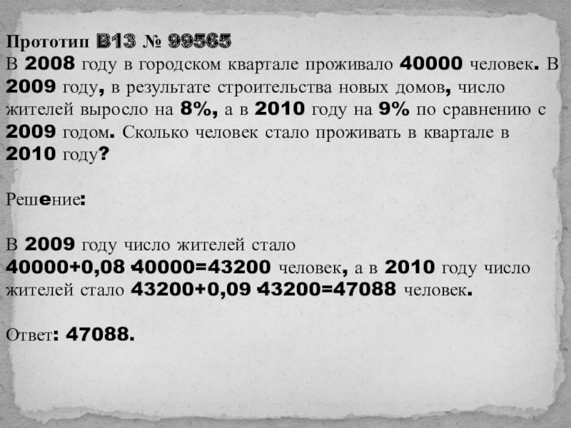 В 2009 году число жителей стало 40000+0,08·40000=43200 человек, а в 2010 году число жителей стало 43200+0,09·43200=47088 человек.