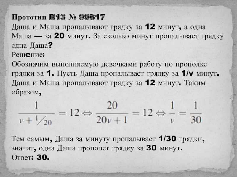 Обозначим выполняемую девочками работу по прополке грядки за 1. Пусть Даша пропалывает грядку за 1/v минут. Даша и Маша пропалывают грядку за 12 минут. Таким образом,