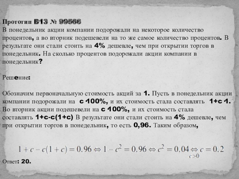 Обозначим первоначальную стоимость акций за 1. Пусть в понедельник акции компании подорожали на c·100%, и их стоимость стала составлять 1+c·1. Во вторник акции подешевели на c·100%, и их стоимость стала составлять 1+c-c(1+c) В результате они стали стоить на 4% дешевле, чем при открытии торгов в понедельник, то есть 0,96. Таким образом,